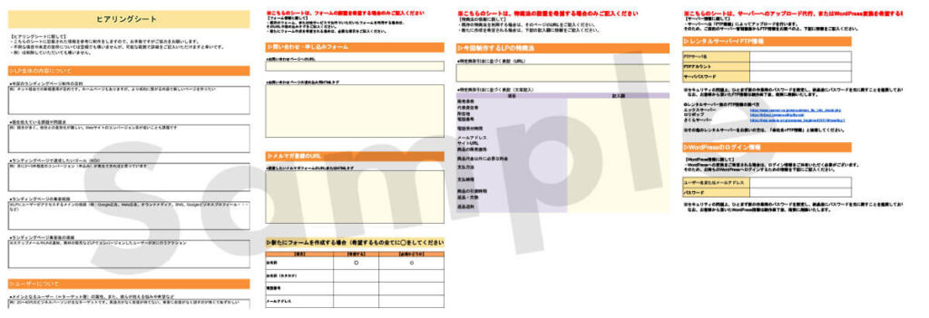 LPを制作するために必要な情報をご記入いただくシートになります。ご記入後に返送いただきますようお願いいたします。
